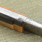 刀身は細身の小柄小刀、、指裏に小沸の付いた直刃が見えています。 また鞘は朴木で作られており、鞘の中で刀身が動くことはありません。