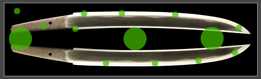 刃 山六つの小湾れ 湾れの頭に小互の目 小丁子あり 沸がちで焼刃低い