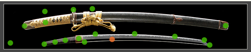 刃文は 宗次得意の 備前写しにて、角張った互の目を主体に、複式互の目なども混ぜ、なるほど一見末備前と思わせるほどに。 また丁寧な 差込研ぎ により、刃文の細やかな働きが はっきりと現れ